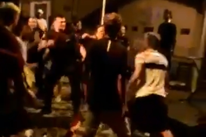 No vídeo, não é possível ver o início da briga. As imagens mostram, além de troca de socos, empurrões e pessoas caindo ao chão, cadeiras e garrafas de vidro sendo arremessadas em meio à gritaria.