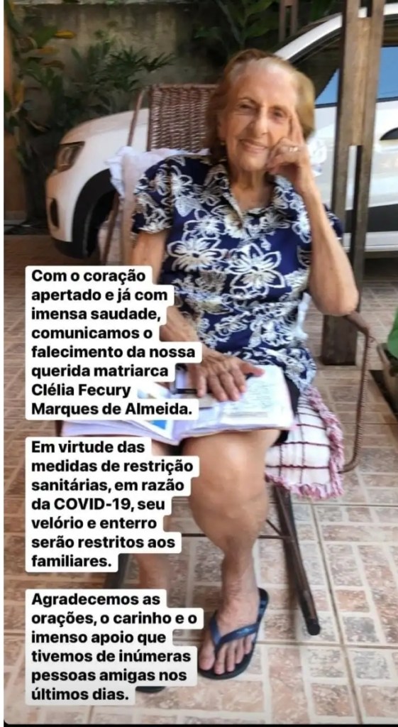 “Com o coração apertado e já com imensa saudade comunicamos o falecimento da nossa matriarca Clélia Fecury Marques de Almeida”, escreveu Binho agradecendo o carinho e oração direcionados à mãe em seus últimos dias.