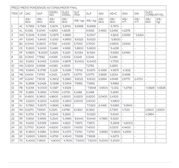 A tabela traz o preço médio ponderado ao consumidor final para todos os Estados. Nesta tabela, a maioria dos Estados teve reajuste no valor dos combustíveis.