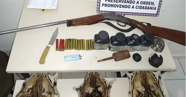 Ato contínuo, os militares foram ao local e lograram êxito na apreensão da arma de fogo, munições e, ainda, restos mortais de animais silvestres.