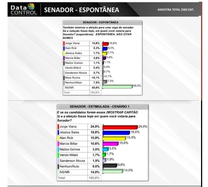 Segundo as planilhas envidas para o blog via zap zap, o Data Control ouviu 2.502 pessoas entre os dias 12 e 22 de outubro deste ano nas cidades de Rio Branco, Cruzeiro do Sul, Sena Madureira, Tarauacá, Feijó, Brasileia, Porto Acre, Mâncio Lima Plácido de Castro, Xapuri, Epitaciolândia, Rodrigues Alves, Bujari, Acrelândia Capixaba, Manoel Urbano e Assis Brasil. O percentual de erro da pesquisa é de 2,00% para mais ou para menos. O nível de confiança, ou seja, quando a realidade das ruas se reflete nos números, é de 95%.