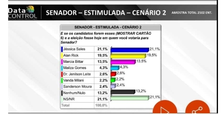 O Data Control elaborou dois cenários para a pesquisa estimulada. No segundo cenário Jorge Viana perde o medo e enfrenta Gladson na disputa pelo governo, invertendo papel com Jenilson Leite (PSB) que concorreria ao Senado. Neste cenário, a Skatista Jéssica Sales lidera sem precisa de manobras radicais. A emedebista estaria com 21,1% das intenções de voto. Na sequência, Alan Rick aparece com 19,5%. Marcia Bittar com 13,5%, contra 4,3% da atual senadora Mailza Gomes (PP/AC). Jenilson Leite (PSB) tem 2,6%. Vanda Milani com 2,2% e o advogado Sanderson Moura com 2,4%.