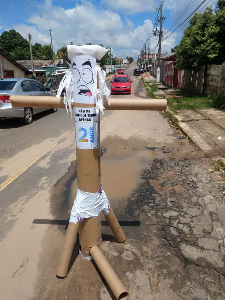 Uma gráfica do município de Cruzeiro do Sul, interior do Acre, confeccionou um boneco de papelão e colocou em um buraco que fica localizado no bairro do Remanso, na rua Goiás.