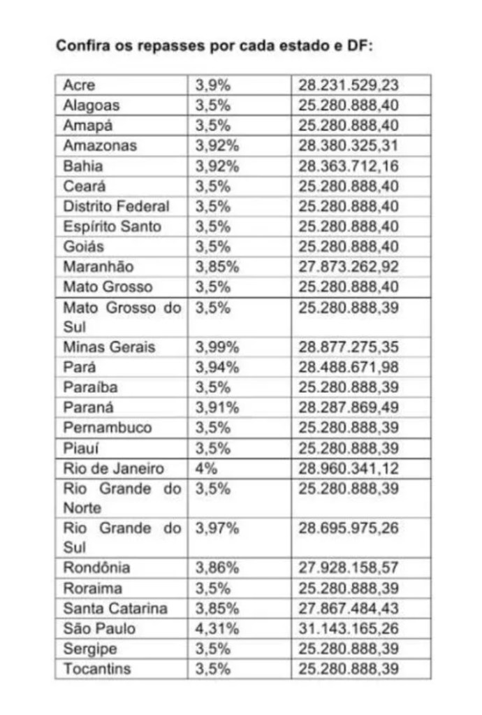 Confira os repasses por cada Estado e DF: