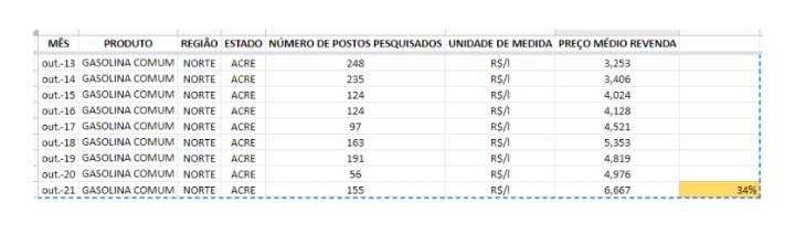 O preço médio de revenda da gasolina comum subiu 34% entre os meses de outubro de 2020 e outubro de 2021 no Acre. O preço no Estado saltou de R$ 4,976 para R$ 6,667 por litro entre um e outro ano.