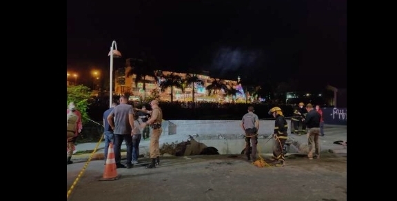 O público acompanhava a abertura das festividades de Natal, com início às 19h45 desta segunda-feira (22), quando a calçada cedeu. O acidente foi registrado por câmeras de participantes do evento.