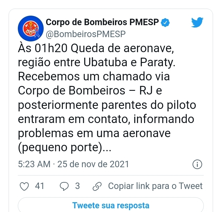 O Grupamento de Bombeiros Marítimo da Ubatuba atendeu a ocorrência e encaminhou uma embarcação com cerca de quatro tripulantes para realizar as buscas na área informada. O Corpo de Bombeiros do Rio de Janeiro, acionado às 23h46 da quarta-feira (24), também presta apoio na procura pela aeronave e pelas vítimas.