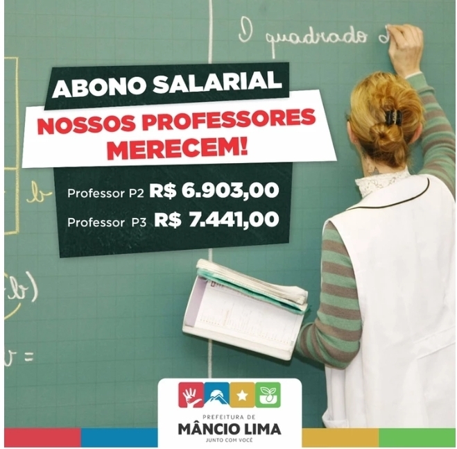 Após a aprovação do TCE-AC, que autorizou o cumprimento da obrigação constitucional de utilização de 70% dos recursos do Fundeb no pagamento dos profissionais da educação, o Município de Mâncio Lima submeteu junto a Câmara de Vereadores a Lei Municipal 462, de 02 agosto de 2021 concedendo o abono salarial da seguinte forma: Professor p2 R$ 6.903 e Professor p3 R$ 7.441,00.