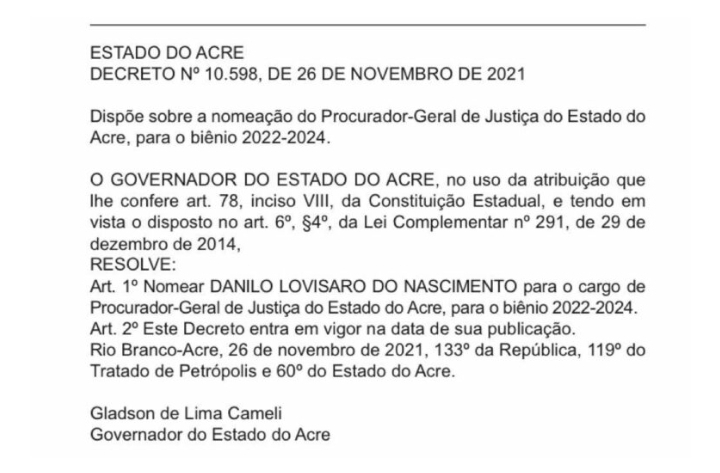 O governador Gladson Cameli oficializou a nomeação do procurador de justiça Danilo Lovisaro como novo procurador-geral de justiça do Ministério Público, pelo biênio 2022-2024. O decreto de nomeação consta na edição desta segunda-feira, 29, do Diário Oficial do Estado.