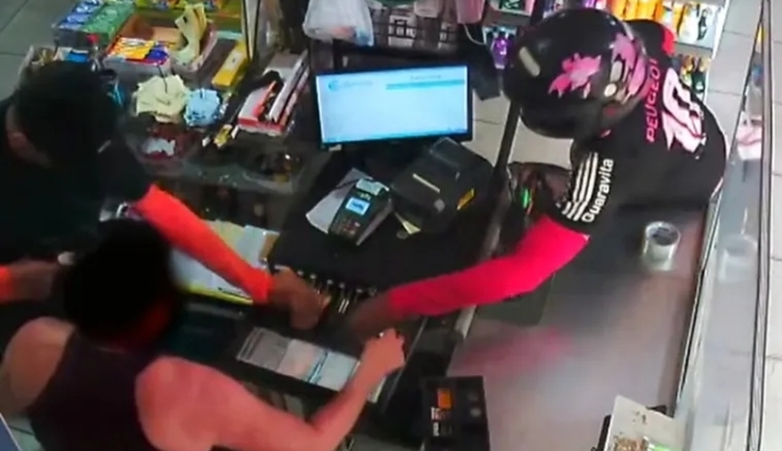 Já em outro vídeo, 6 minutos depois, os homens chegam a um posto de combustível e levam o dinheiro do frentista. Nos dois vídeos é o mesmo homem que age enquanto o outro dá retaguarda.