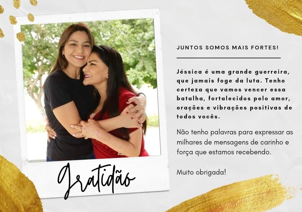 Começando essa semana com o coração repleto de gratidão! Não tenho palavras para expressar as milhares de mensagens de carinho e força que estamos recebendo, em virtude do momento delicado que envolve a saúde da minha amada filha @jessicasalesdeputada . Junto com vocês, vamos ultrapassar momento difícil, com muita fé, coragem e determinação, na certeza que Deus nos guia rumo a vitória da plena recuperação dela. Jéssica é uma grande guerreira, que jamais foge da luta. Tenho certeza que vamos vencer essa batalha, fortalecidos pelo amor, orações e vibrações positivas de todos vocês. Minha gratidão a todos! Que nossos dias sejam abençoados sempre!