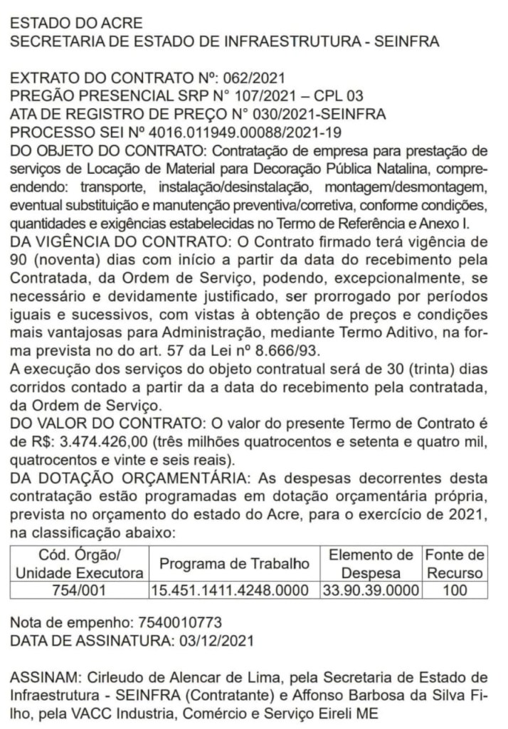 O governo do Acre inaugurou na noite desta segunda-feira, 20, a decoração natalina de 2021. O governador Gladson Cameli não pôde estar presente, mas de acordo com o secretário de Infraestrutura, Cirleudo Costa, foram investidos mais de R$ 3 milhões de reais na ornamentação que ficará à disposição do público.