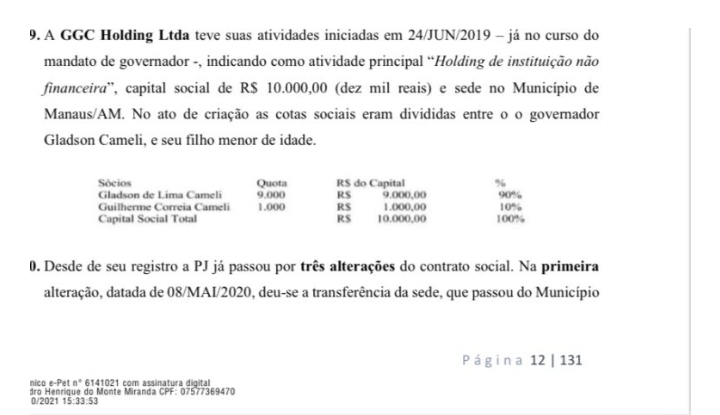 Desde a data de sua criação, em 24 de junho de 2019, a GGC Holding (a sigla é uma possível referência a Gladson e Guilherme Cameli) passou por três alterações cadastrais. Uma delas foi a mudança de sua sede, saindo da capital do Amazonas transferida para Rio Branco e, por fim, para Cruzeiro do Sul. A empresa tinha como atividade principal “holding de instituição não financeira” quando da criação.