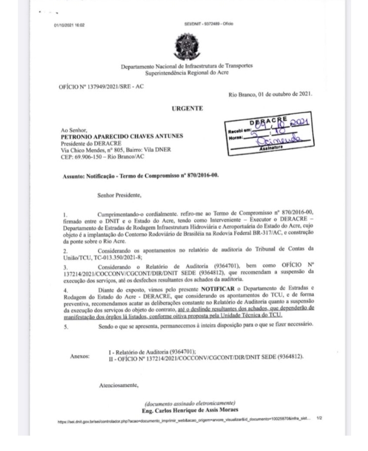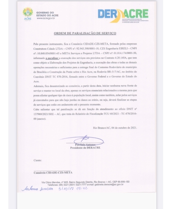 No dia 4 de outubro do ano passado, o superintendente do Dnit no Acre, Carlos Henrique Moraes, notificou o diretor-presidente do Deracre, Petrônio Antunes, para determinar a paralisação das obras imediatamente.