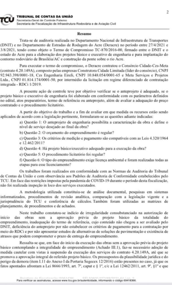 “Na oportunidade o Deracre comunicou ainda sobre a existência de outra OS emitida em 3/9/2021 para execução dos serviços da própria ponte. Embora tenha encaminhado a manifestação do Deracre a respeito das OSs emitidas e informado que não teria autorizado a emissão de tais OSs, o DNIT não informou quais providências seriam adotadas”.