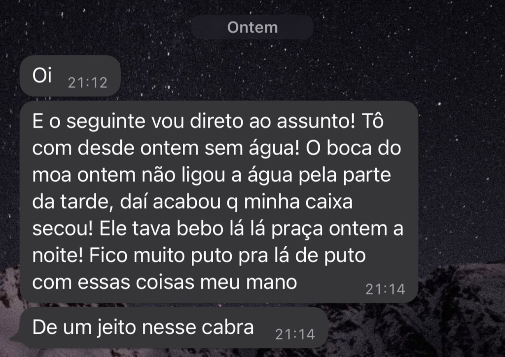 Pelo menos 04 moradores procuraram O jornal Notícias do Juruá, para denunciar a péssima distribuição de água na comunidade. Segundo eles, o funcionário responsável pela distribuição vive embriagado no serviço, algo que dificulta a precisão na hora da distribuição.