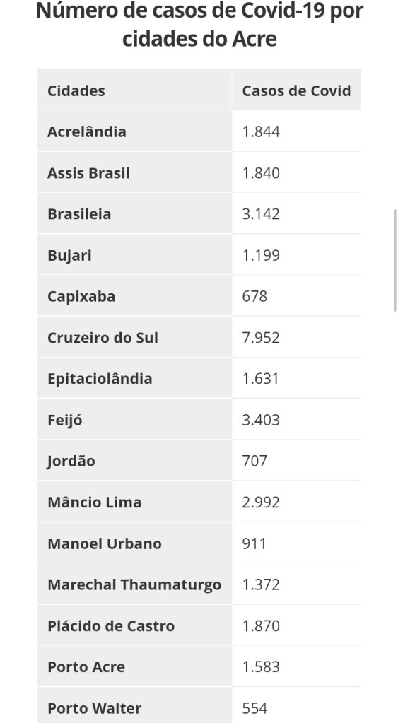 Com mais de 1,1 mil novos casos, o Acre contabilizou o maior número de infectados pela Covid em 24 horas desde o início da pandemia nessa quarta (19).