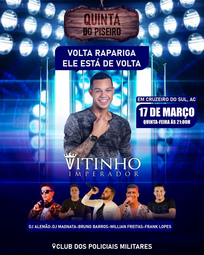 O Cantor Nacional Vitinho Imperador, se apresentará em Cruzeiro do Sul no dia (17/03) de março, no Clube dos Policiais Militares.