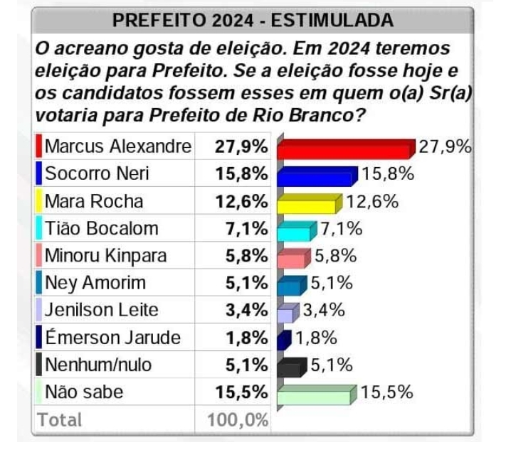 O levantamento mostra o ex-prefeito Marcus Alexandre (sem partido) na frente com 27, 9%; a também ex-prefeita e agora deputada federal eleita Socorro Neri (PP) surge em segundo com 15, 8%; Mara Rocha (MDB) tem 12, 6%; o atual prefeito de Rio Branco, Tião Bocalom aparece com 7, 1%; Minoru Kinpara (PSDB), 5, 8%; Ney Amorim (Podemos) tem 5, 1%; Jenilson Leite (PSB) 3, 4% ; Emerson Jarude 1,8%.